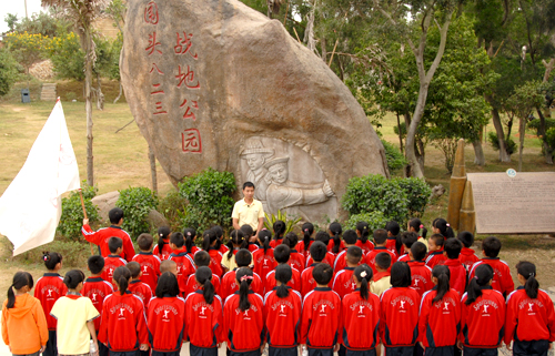 圍頭村主任洪水平在八·二三公園給學生講歷史。(夏庚元 攝)