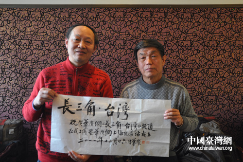 作為上海臺協(xié)贈送給;鶗ざ麻L“吉地和風”國畫作品的作者、大陸書畫名家楊華耀先生聞訊華廣網(wǎng)上海站成立,欣然提筆書寫了“長三角-臺灣”五個大字。(中國臺灣網(wǎng)發(fā) 玉龍 攝)