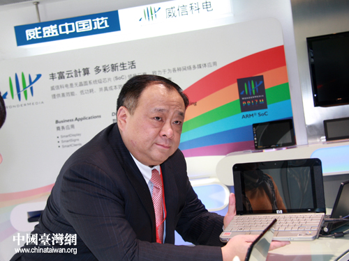 自2000年入駐大陸,威盛在掌門人徐濤的引領下,將“中國芯”理念在中國大陸落戶生根,威盛的“中國芯”民族科技品牌形象得到社會各界的普遍認可,深入人心。圖為徐濤向記者展示威盛中國推出的新產品。(中國臺灣網 楊麗 攝)