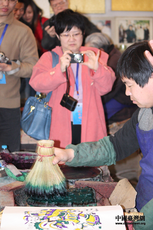 兩岸三地記者聯合采訪團3月25日上午參訪河南開封朱仙鎮木版年畫(中國臺灣網記者 王文英 攝)