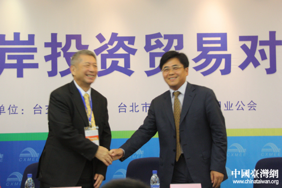 臺(tái)交會(huì)組委會(huì)副主任、廈門市副市長(zhǎng)張燦民與臺(tái)北市進(jìn)出口商業(yè)同業(yè)公會(huì)理事長(zhǎng)劉國(guó)昭共同出席對(duì)接會(huì)。(中國(guó)臺(tái)灣網(wǎng) 王思羽 攝)