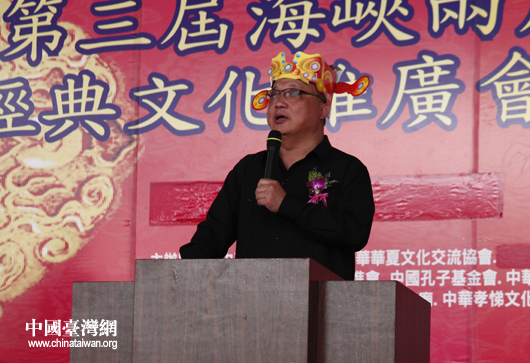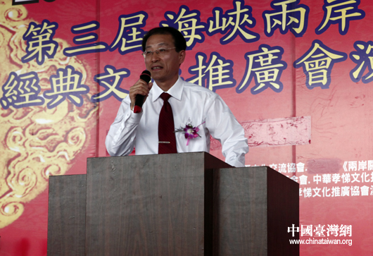 濟南市教育學會參訪團團長鄒衛平在第三屆海峽兩岸經典文化推廣會演致辭(中國臺灣網 邢同林 攝)