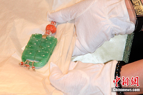6月4日,“皇家風尚─清代宮廷與西方貴族珠寶”特展開箱記者會在臺北舉行,來自沈陽故宮的“透雕雙喜翡翠墜”搶先亮相。此佩墜為清朝末代皇帝溥儀大婚時,皇后婉容佩戴之物。佩墜由碧綠的整翠雕刻而成,總體呈長方形,透雕一個“雙喜”漢字。中新社發 董會峰 攝
