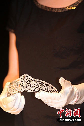 6月4日,由臺北故宮博物院、沈陽故宮博物院及卡地亞典藏共同舉辦的“皇家風尚─清代宮廷與西方貴族珠寶”特展開箱記者會在臺北舉行。圖為卡地亞典藏1910年為比利時伊麗莎白女皇特制的“卷軸式頭冠”,以漩渦形裝飾和皇家桂冠為主題,款式更女性化、輕盈。中新社發 董會峰 攝