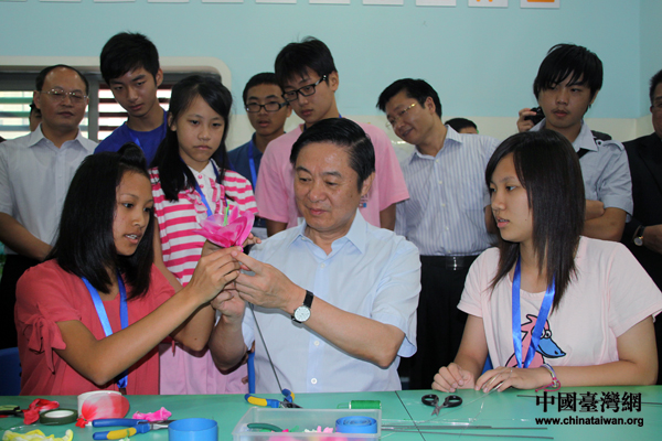 應(yīng)中共四川省委書記劉奇葆邀請,臺灣云林縣、南投縣和彰化縣的105名師生,由臺灣民意代表馬文君、王惠美帶隊(duì),赴四川參加第三屆“臺灣學(xué)生天府夏令營”活動。圖為劉奇葆饒有興致地欣賞臺灣小朋友制作的模型。(中國臺灣網(wǎng) 王偉 攝)