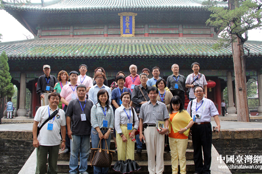 “情系齊魯——兩岸文化聯誼行”參訪團嘉賓在亞圣殿前合影留念。(中國臺灣網 芮益芳 攝)