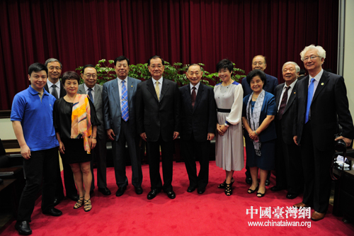 參訪團團長武韜(左五)、中央電視臺陳鐸(右一)、書法大師王成喜(右二)、于丹教授(右五)及京劇大師梅葆玖(右六)等一行拜會中國國民黨榮譽主席連戰(zhàn)(左六)。(圖片來源:中國臺灣網(wǎng))