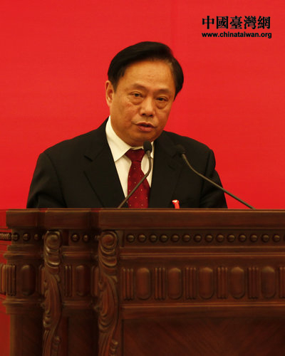 中華全國臺灣同胞聯誼會會長梁國揚代表全國臺聯第八屆理事會作工作報告。(中國臺灣網 郭瑩瑩 攝)