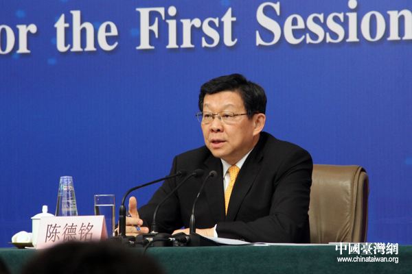 十二屆全國人大一次會議8日上午在梅地亞中心舉行記者會,商務部部長陳德銘就“發展國內外貿易和促進經濟合作”的相關問題回答了中外記者提問。( 中國臺灣網 楊麗 攝)