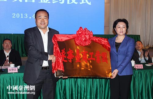 四川省政府副秘書長吳顯奎(左)為遂寧授“遂寧臺(tái)商工業(yè)園”牌匾,遂寧市副市長鄧為(右)接牌。