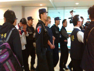 朱姓和胡姓男子在警方人員重重戒護,兩人分別銬上手銬,其中一人還上腳鐐,以防萬一。兩人戴著口罩,用雙手捂著臉,在機場一路上低頭不語。臺“刑事局”隨后將兩人押上車,離開桃園機場。(中國臺灣網(wǎng) 周劍)