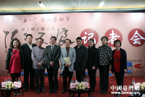 交響南音《陳三五娘》專場音樂會將于28日晚7時30分在國家大劇院音樂廳上演。圖為音樂會主辦方及主創人員在25日下午舉行的記者會上合影。(中國臺灣網 楊麗 攝)