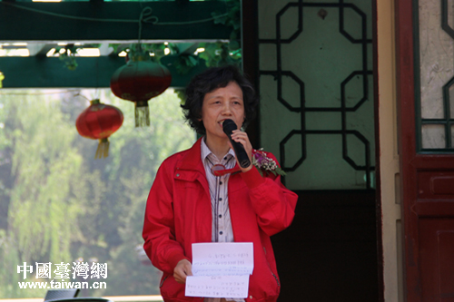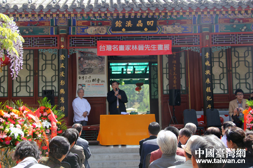 1日上午,臺灣著名畫家林晉先生畫展首次在京展出。北京海峽兩岸書畫家聯誼會副會長祖莪致歡迎辭。(中國臺灣網 楊麗 攝)