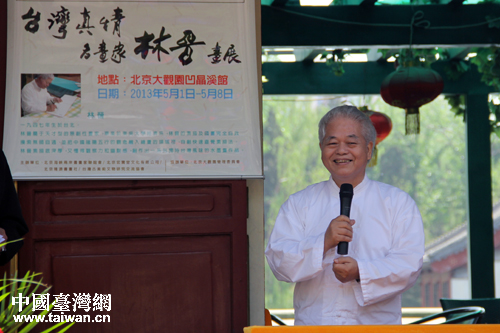 1日上午,臺灣著名畫家林晉先生畫展首次在京展出。書畫展以“臺灣真情”為主題,共展出作品30余幅。圖為林晉先生在開展儀式上。(中國臺灣網 楊麗 攝)