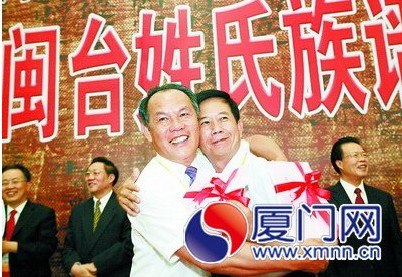 交換族譜后,來自海滄的謝福坤與來自臺灣桃園縣的謝和宗緊緊相擁。(來源:廈門日報)