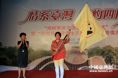 四川省人民政府副省長黃彥蓉向“臺灣學生天府夏令營”團長、臺灣新北市三峽中學校長劉臺光授“第四屆臺灣學生天府夏令營”營旗。(中國臺灣網 馬迪 攝)