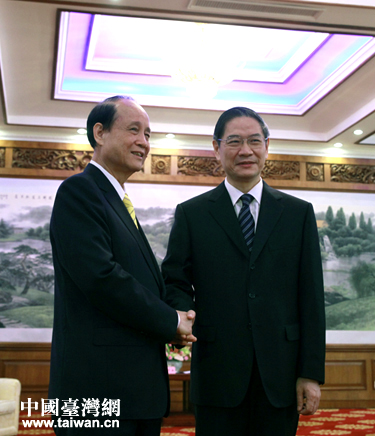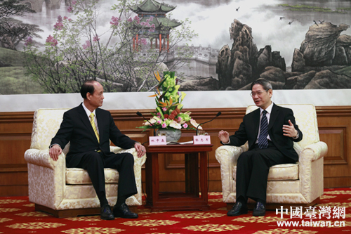 中共中央臺辦、國務(wù)院臺辦主任張志軍(右)14日在北京會見了臺灣海基會董事長林中森及其率領(lǐng)的臺灣媒體高層大陸參訪團。(中國臺灣網(wǎng) 王偉 攝)