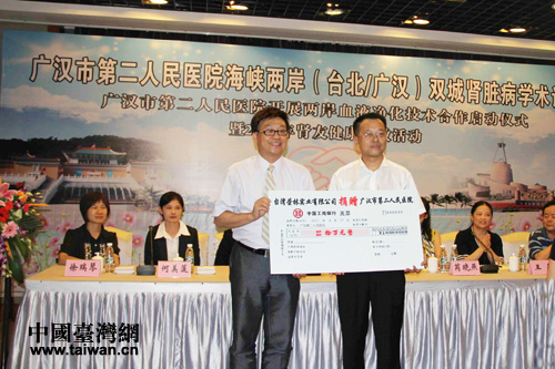 交流會上,臺灣專家新光醫院和上海市臺商協會向廣漢市第二人民醫院捐贈了價值10萬元的血透耗材,同時舉行了“海峽兩岸血液凈化技術合作服務”的啟動儀式。