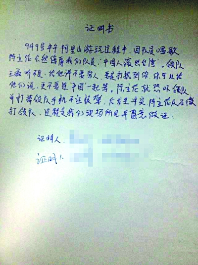 為了確證自己所言無誤,王磊向北青報(bào)記者提供了一份由團(tuán)里兩名游客書寫的證明書,并準(zhǔn)備作為以后打官司的證據(jù)。該文肯定了因唱歌遭到臺北男子辱罵后,王磊前去和解,但遭繼續(xù)挑釁并被打掉手機(jī)而發(fā)生沖突的事實(shí),“過程是我們現(xiàn)場所見并愿意作證”。王磊向北青報(bào)記者提出保護(hù)證明人信息的申請,北青報(bào)記者隱去了兩位游客的姓名及電話。