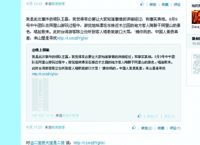 這一事件被報(bào)道后,激起了網(wǎng)民的點(diǎn)評。昨日大陸當(dāng)事游客和領(lǐng)隊(duì)認(rèn)為該臺北市民言論失實(shí),微博上公開發(fā)聲明澄清。文中稱,游客因唱山歌遭28歲臺灣男子陳立倫大罵:中國人滾出臺灣!還夾雜“干你娘”等不堪入耳言辭。王磊(領(lǐng)隊(duì))前去和該男子交涉說:“如果覺得聲音大,我可以跟游客說,你別罵人。”但該男子繼續(xù)出言不遜,打掉王磊手機(jī),并進(jìn)行了推搡。其間,與該男子同行的一名女游客稱要打官司:“讓你們以后都不能來臺灣。”