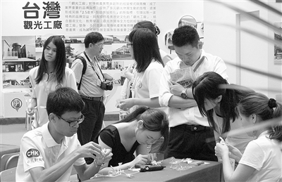 臺博會上,臺灣觀光工廠主題館內熙熙攘攘,DIY體驗區內,磚雕彩繪、緞帶兔吊飾、植物精油項鏈等趣味盎然的免費DIY活動,讓市民們玩得不亦樂乎;交流洽談區內,一撥又一撥有意發展觀光工廠的本地制造業企業,則虔誠地前來“取經”。