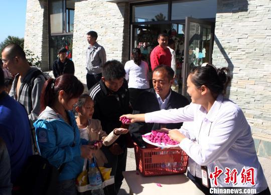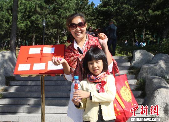 2日上午,威海劉公島國家森林公園主任王建松在臺贈大陸動物族譜上填上“天天”的名字。工作人員還準(zhǔn)備了雞蛋、花生等禮品,分發(fā)給現(xiàn)場游客,慶祝小鹿?jié)M月。