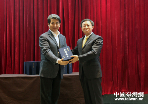 臺(tái)海出版社社長(zhǎng)馬鐵向國臺(tái)辦新聞局局長(zhǎng)楊毅贈(zèng)書。(中國臺(tái)灣網(wǎng) 王怡然 攝)