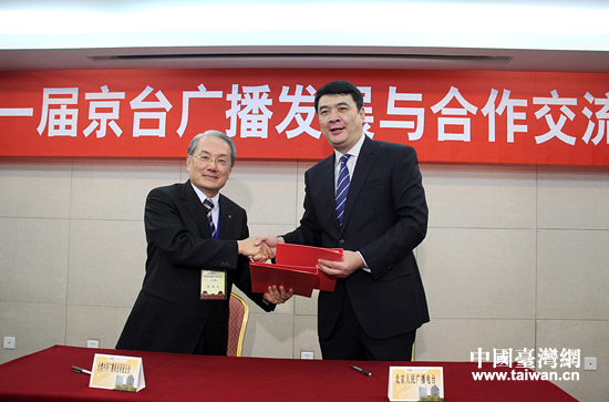 15日,第一屆京臺廣播發展與合作交流會15日在北京廣播大廈召開。北京人民廣播電臺和臺灣中華廣播商業同業會簽訂合作意向書。(中國臺灣網 普燕 攝)