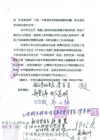 《中華故土親情林 華夏紐帶千秋心宣言》即第一份宣言的部分署名手跡