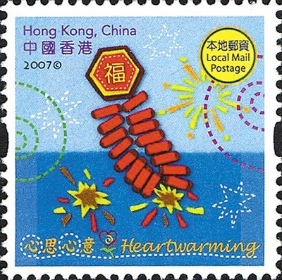 香港2007年12月28日推出的一套4枚《心思心意》郵票,有一枚直接以一掛燃放的鞭炮為主圖(圖③),鞭炮上端還印著一個大大的“福”字,構圖簡潔明了,寓意深刻。(文/司徒一凡)