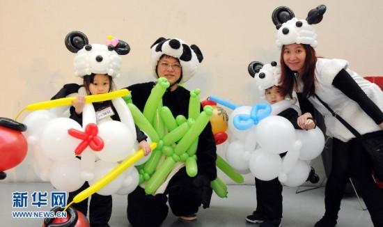 2月15日,雙胞胎陳梅兒(左一)、陳其旦(右二)與家人打扮成大熊貓“圓仔”家族出席活動。當日,臺北市舉辦第二屆“雙胞胎幸?倓訂T”活動,415對雙胞胎和三胞胎家庭齊聚一堂,分享成長經驗。 新華社發(吳景騰 攝)