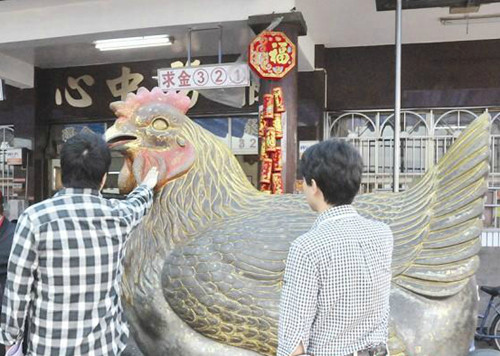 說紫南宮“俗”,是因為這是民眾“求財”的好去處。母雞算是紫南宮的吉祥物了,因為雞能生蛋、蛋能生雞……循環(huán)不止,這會生財。在離宮廟三四十米的地方,便有一個雞孔,上面是只母雞雕塑,下面有個圓洞,據說從圓洞鉆過的人,財氣會比較旺。在廟門的一側,還有一只碩大的母雞雕塑。廟方負責人介紹,摸了這只母雞會讓你發(fā)財。說起這尊雕像,還跟福建有淵源,十多年前,廟方在泉州發(fā)現一塊石頭,非常適合雕母雞,便將其買來跨海運到臺灣,做成了這只人見人愛的“金雞母”。