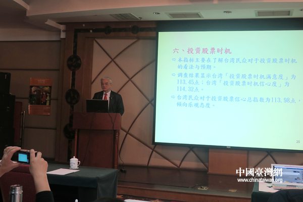 2014第四季度兩岸四地消費者信心指數(shù)8日在京發(fā)布,圖為臺灣輔仁大學統(tǒng)計資訊學系教授謝邦昌對臺灣地區(qū)消費者信心指數(shù)進行分析(中國臺灣網(wǎng) 李徽 攝)