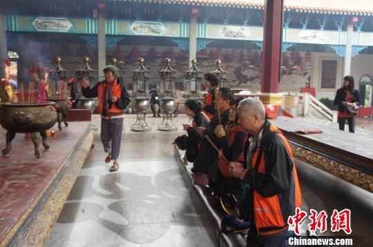69歲的信眾許伯在廟中替孫子求了一支簽,“希望我孫子今年身體健康,一家人都平平安安就最好了。”許伯笑著說,他11歲的孫子是團內年齡最小的成員。