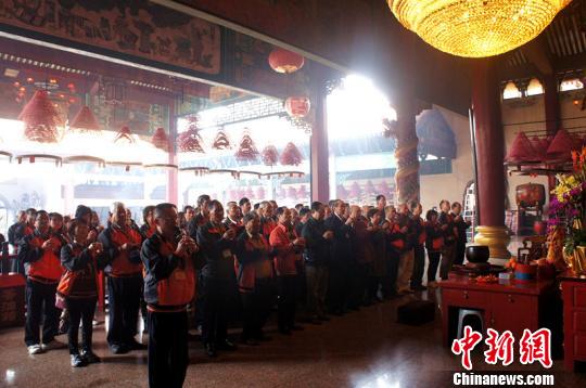 來訪的臺灣信眾按照傳統文化民俗,參拜大廟中供奉的神祇,虔誠地鞠躬、進香,為兩岸信眾祈福添壽。