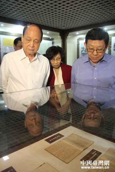 24日下午,海協會會長陳德銘夫婦與海基會董事長林中森夫婦一起在福州馬尾參觀了中國船政文化博物館,圖為海協會會長陳德銘與海基會董事長林中森參觀當年海校學生的筆記本。(中國臺灣網 張潔 攝)