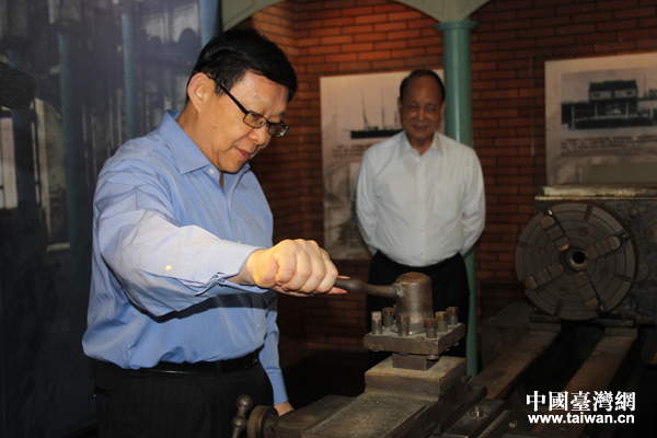 24日下午,海協會會長陳德銘夫婦與海基會董事長林中森夫婦一起在福州馬尾參觀了中國船政文化博物館,圖為海協會會長陳德銘操作機床。(中國臺灣網 張潔 攝)