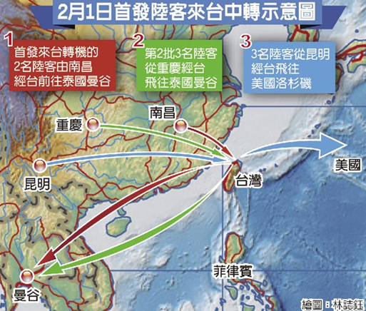 大陸旅客經臺北中轉試點2月1日啟動。第一批來臺中轉的大陸旅客1日上午自江西南昌搭機抵達桃園機場,當天下午轉飛泰國曼谷。定格在歷史瞬間的兩位旅客是大陸年輕人潘春明、陳燕,兩人都是28歲。轉機時,兩人買了58度金門高粱、保溫瓶等伴手禮。