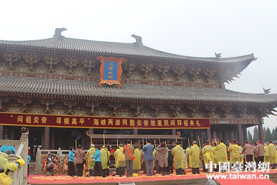 炎帝神像被莊重地安放于大殿之內,來自臺灣的32座宮廟代表向炎帝敬獻牌匾。廣東省東莞臺商子弟學校的學生們跳起“八佾舞”,大袖飄飄,舞姿莊重優美。拜祖人員向神農炎帝分批敬獻花籃,深鞠三躬。