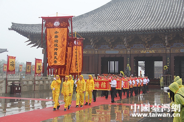 “天地玄黃,宇宙洪荒;泱泱丹水,莽莽太行。惟我始祖,神農炎帝;肇啟農耕,澤被八荒……”14日上午,炎帝陵廣場炎帝大殿在雨中顯得更加雄偉壯觀,在莊重的禮樂聲中,海峽兩岸同胞炎帝故里民間拜祖典禮正式開始,全體肅立,擊鼓九通,鳴鐘九響。
