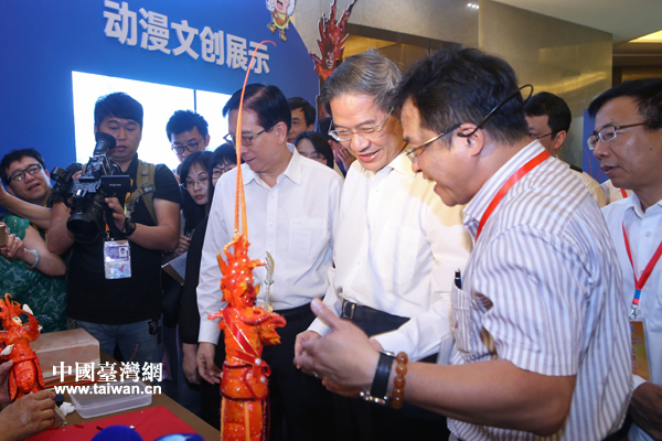 海峽兩岸勞工發(fā)展交流協(xié)會執(zhí)行長蘇明政向張志軍介紹動漫展區(qū)。(中國臺灣網(wǎng) 陳佳慧 攝)