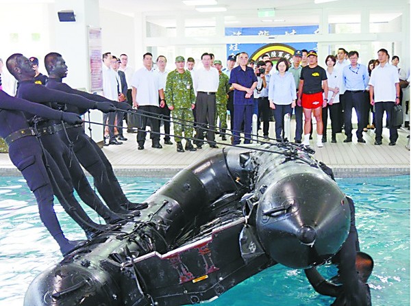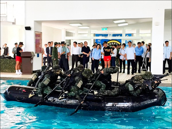據(jù)臺灣《聯(lián)合報》報道,蔡英文10日到金門“勞軍”,由于這是蔡英文上任后首次到金門,行程備受矚目。當天上午,她前往陸軍航特部兩棲偵察營,觀看部隊的操舟戰(zhàn)技及水域戰(zhàn)技綜合演練。不過讓人吃驚的是,這次竟然沒有按慣例在灘頭演練技能,而是選擇在波瀾不驚的游泳池中演練翻舟覆舟等科目。有網(wǎng)友嘲笑稱,“在游泳池也能練出特種兵,長見識了”。
