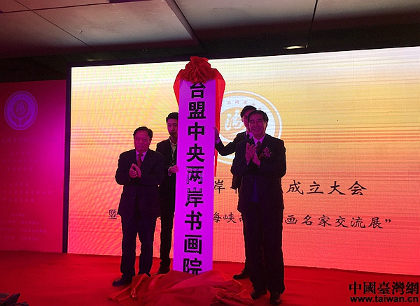 臺(tái)盟中央常務(wù)副主席黃志賢(右一)與臺(tái)盟中央兩岸書畫院院長(zhǎng)梁國(guó)揚(yáng)(左一)為臺(tái)盟中央兩岸書畫院揭牌。(中國(guó)臺(tái)灣網(wǎng) 齊昕 攝)