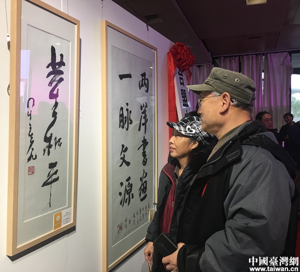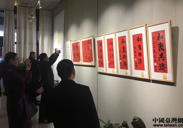 嘉賓為連戰(zhàn)、吳伯雄、朱立倫等人所贈(zèng)書法作品拍照留念。(中國(guó)臺(tái)灣網(wǎng) 齊昕 攝)