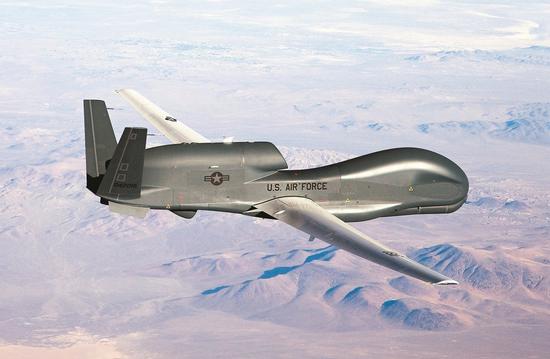 “全球之鷹”偵察機由美國諾斯洛普格魯曼公司生產,是目前全球服役的無人機當中,體型最大的一種,其翼展將近四十公尺,比波音737客機更寬,單價更高達一億三千萬美元,比許多戰斗機更貴。“全球之鷹”使用噴射引擎,比多數無人機飛得更快、更高,巡航高度可達六萬尺,機上具備光學與雷達偵測系統,續航力長達24小時以上,可以長時間對目標區實施監控。