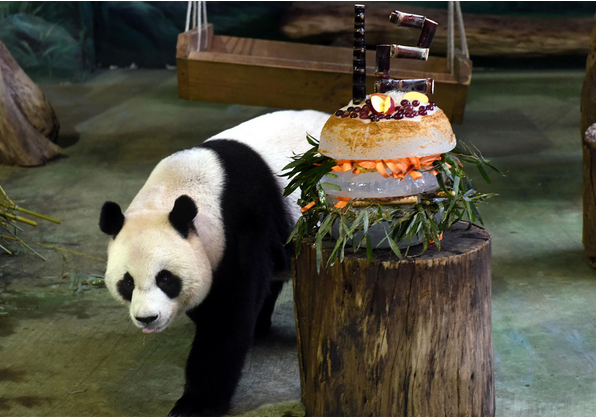 過生日的時候還有特別的驚喜。比如“團團”“圓圓”過8歲生日的時候,保育員用竹子擺成8字型的蛋糕,搭配貓熊愛吃的竹筍、紅蘿卜、還有窩窩頭。12歲生日的時候,“圓圓”獲得了一個像漢堡一樣造型的圓形生日蛋糕,而“團團”則得到一個類似三明治造型的生日蛋糕。蛋糕上面,是由若干根短甘蔗組成的阿拉伯數字“12”,象征它們12歲的到來。