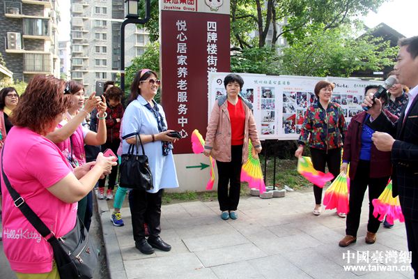 臺(tái)灣客人剛走進(jìn)社區(qū),就被一群正在跳扇子舞的老年人吸引,原來這是正在養(yǎng)老中心前活動(dòng)的附近居民。老人們身姿矯健,喜氣洋洋,幸福快樂都掛在臉上。