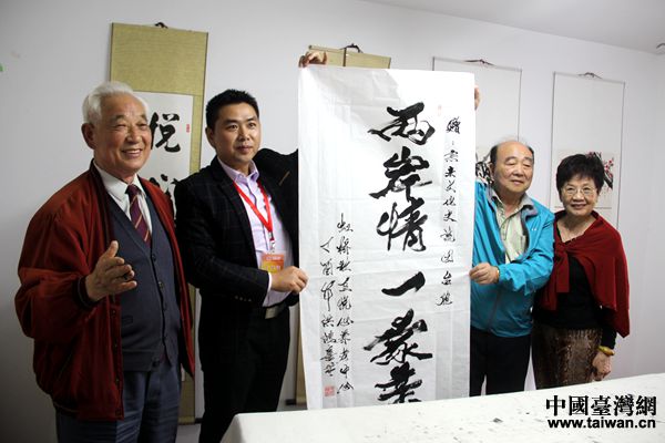 社區(qū)居民洪鴻喜(左一)與臺(tái)灣交流團(tuán)團(tuán)長林豐成(右二)聊得十分投機(jī),這位曾經(jīng)的老兵39年出生,現(xiàn)場揮毫寫下了“兩岸情 一家親”的書法條幅贈(zèng)給臺(tái)灣同胞。(中國臺(tái)灣網(wǎng) 李杰 攝)