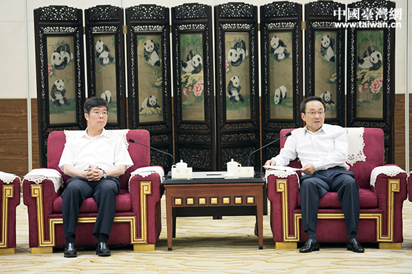 四川省常務副省長王寧(右)會見“海峽兩岸記者四川行”聯合采訪團一行,國務院臺辦主任助理周寧(左)參加會見。(中國臺灣網 于斯文 攝)