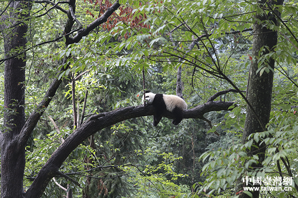 爬上樹干的幼年熊貓。(中國(guó)臺(tái)灣網(wǎng) 于斯文 攝)